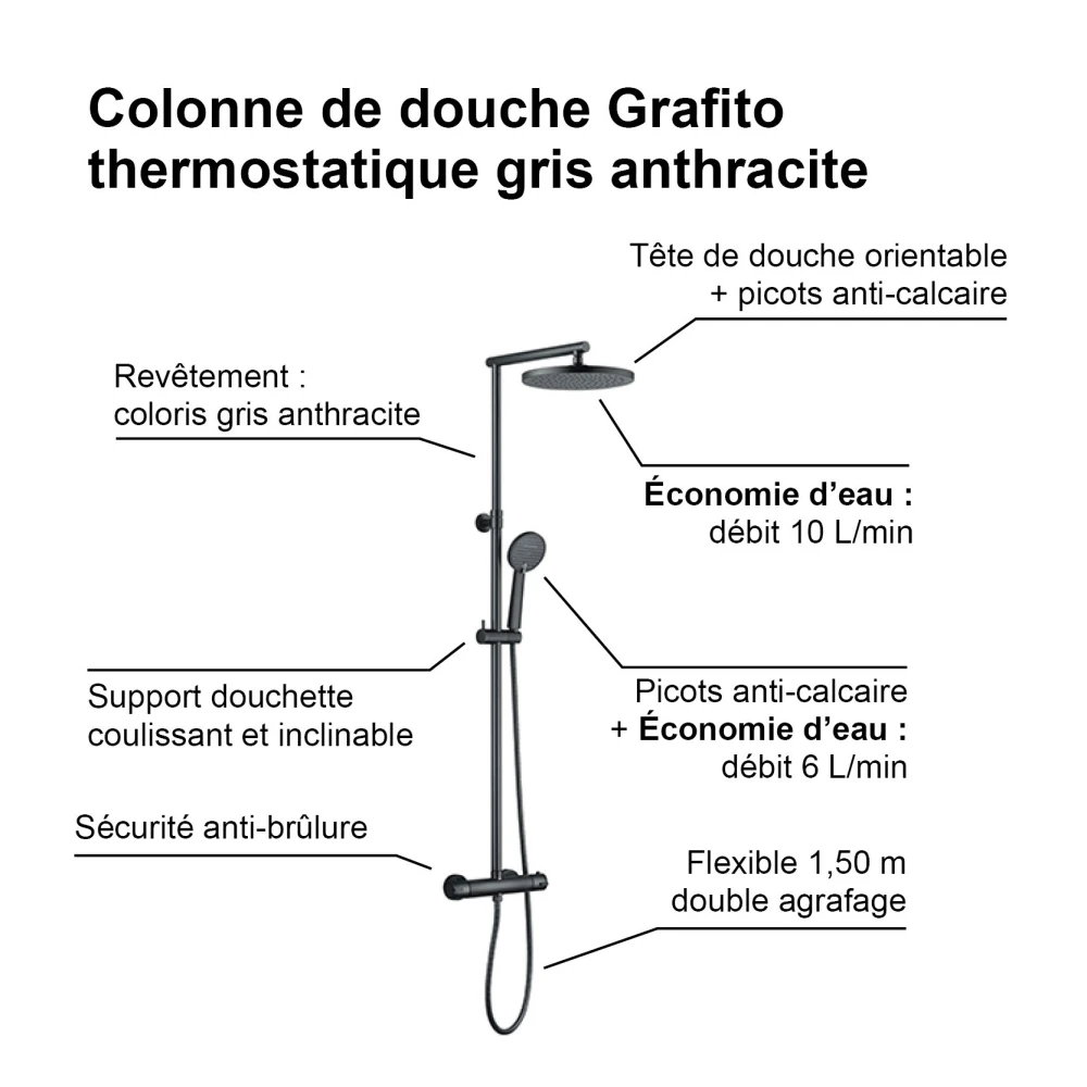 La colonne de douche GRAFITO thermostatique apporte un style moderne à votre salle de bains. Sa large tête orientable et sa douchette 2 jets, toutes deux équipées de picots anti-calcaire assurent un entretien facile.