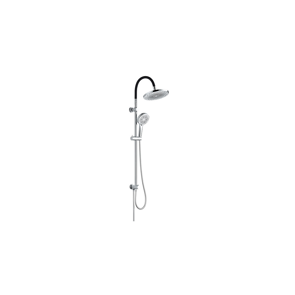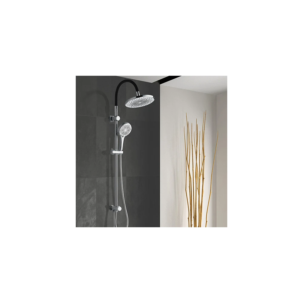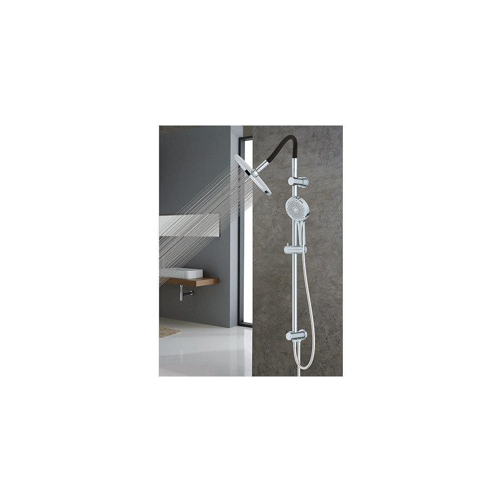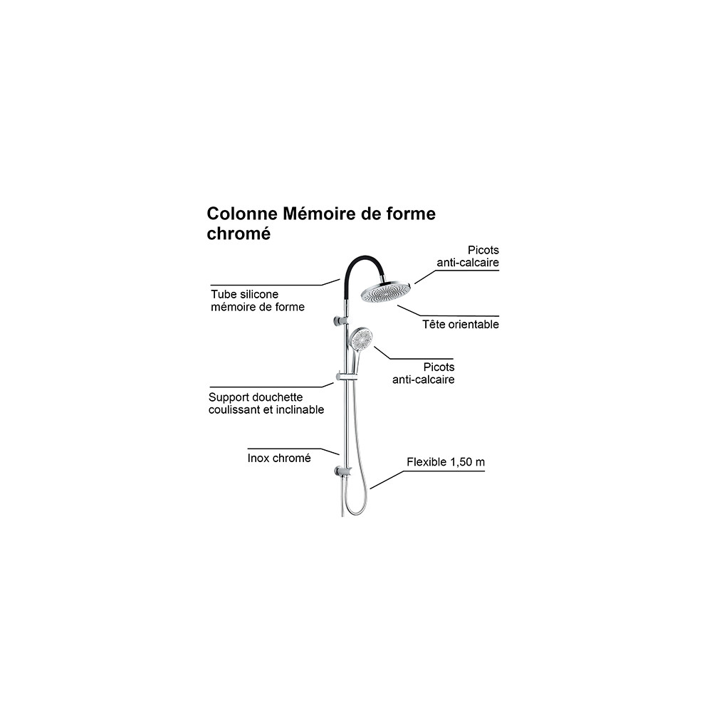 Son bras en inox avec tube silicone mémoire de forme permet d'ajuster facilement la position de la douche, même après l'installation. La colonne comprend également une douchette 3 jets (pluie, massage, pluie + massage) et un flexible anti-torsion de 1,50 m, conçu pour durer.