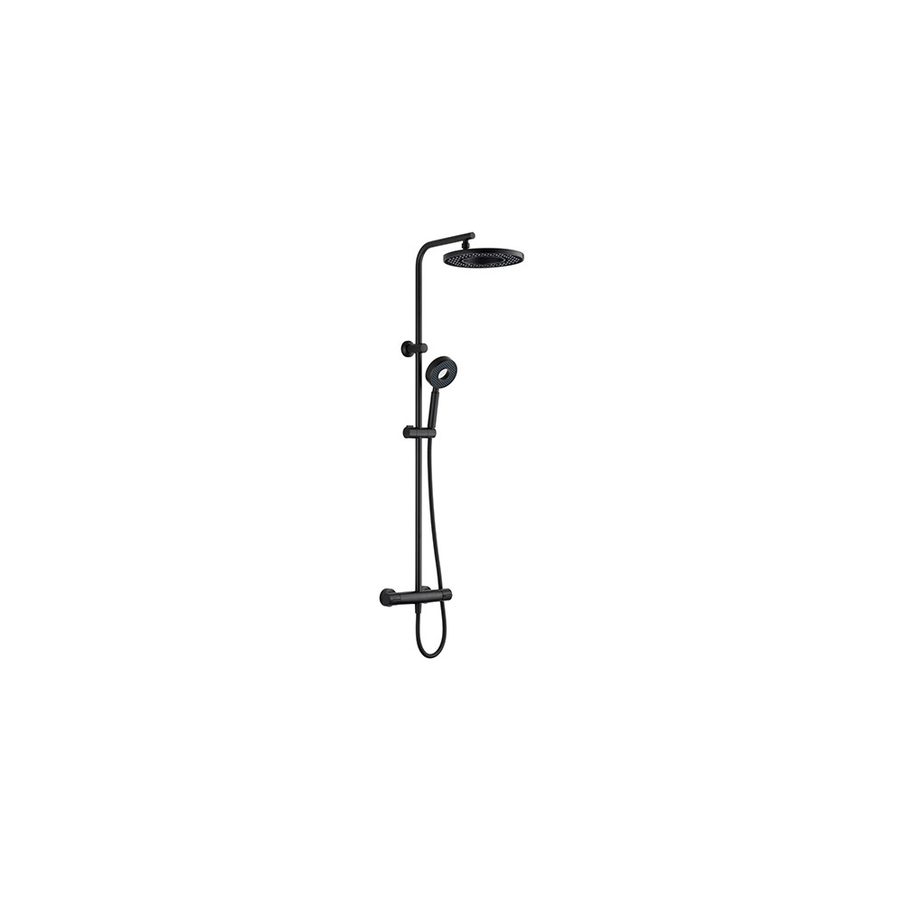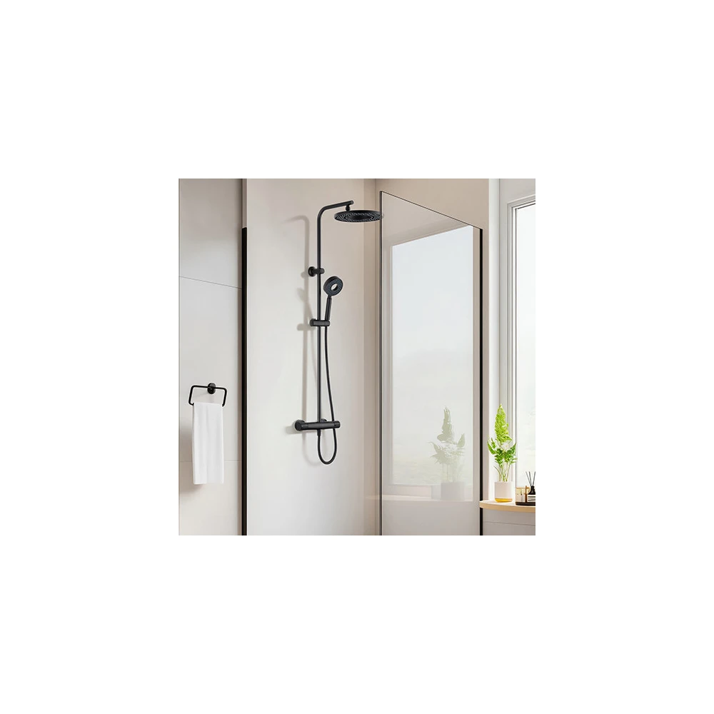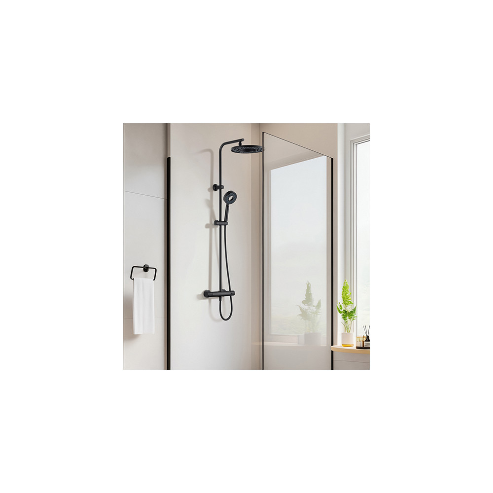 La colonne de douche HOOP est équipée d'une large tête orientable (Ø 250 mm) avec picots anti-calcaire pour un entretien facilité. Son débit auto-régulé à 9 L/min permet une consommation d'eau maîtrisée.