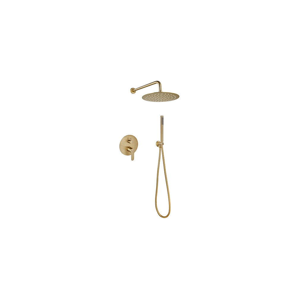 Ce modèle est conçu pour une installation murale à encastrer. Il comprend un bras de douche métallique, un support de douchette mural et un flexible inox renforcé. La robinetterie encastrée nécessite l'utilisation du boîtier d'encastrement fourni, ainsi que des raccordements spécifiques (non fournis). Sur un mur plein, ce boîtier permet de sceller solidement le robinet dans la paroi.
