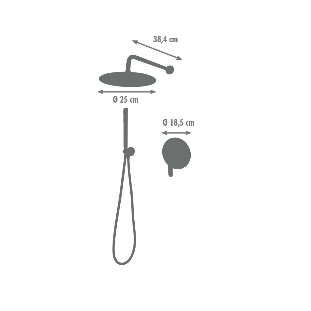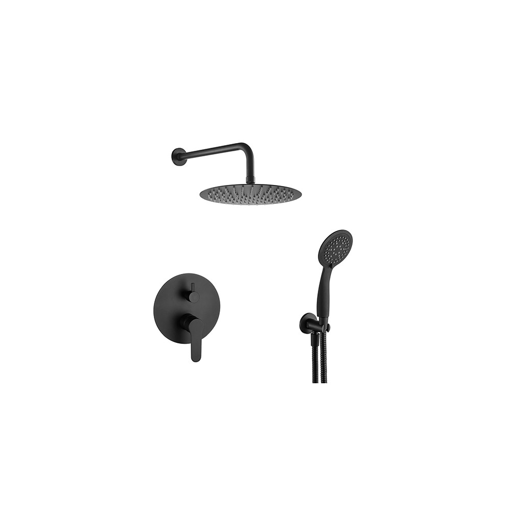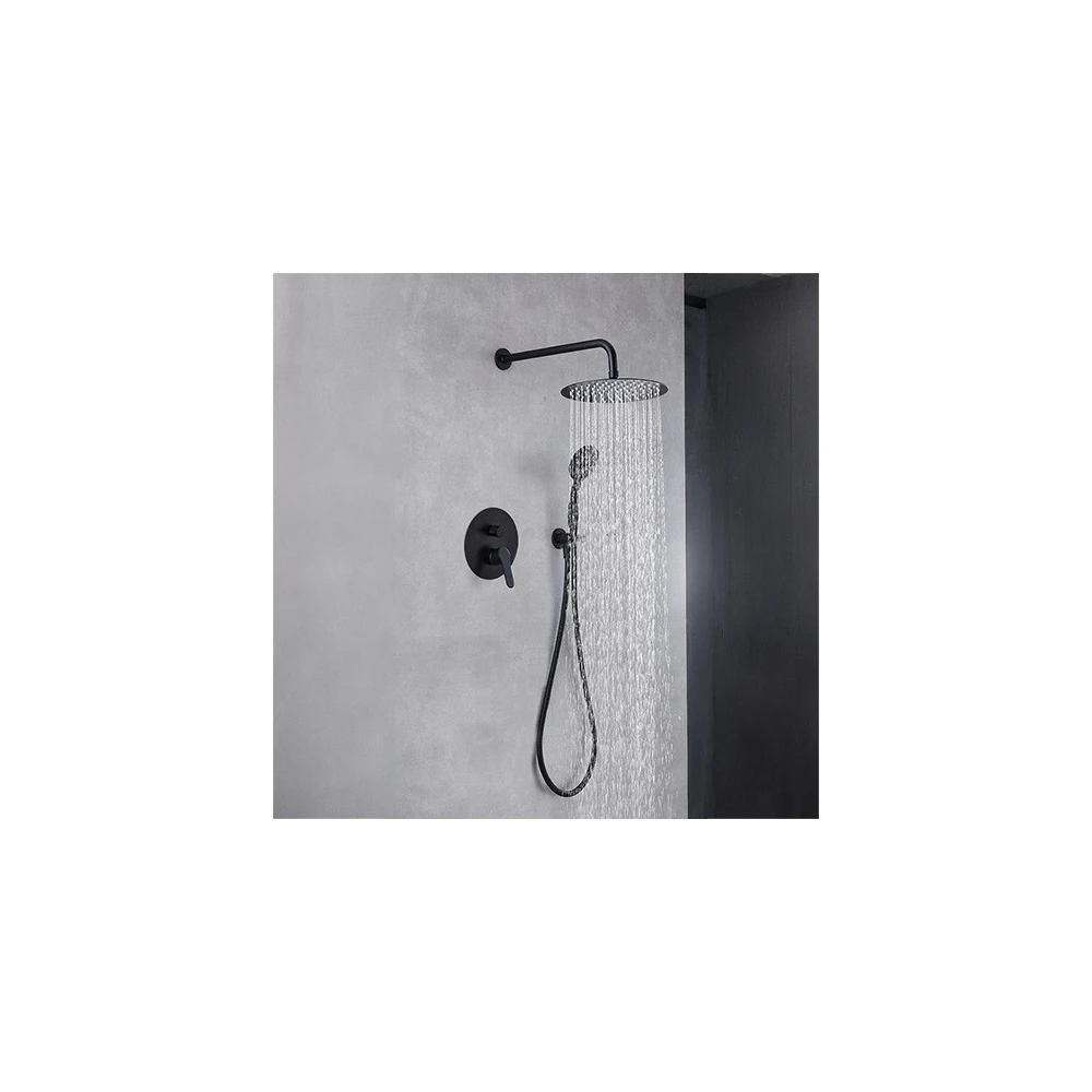 Ce modèle est conçu pour une installation murale à encastrer. Il comprend un bras de douche métallique, un support de douchette mural et un flexible inox renforcé. La robinetterie encastrée nécessite l'utilisation du boîtier d'encastrement fourni, ainsi que des raccordements spécifiques (non fournis). Sur un mur plein, ce boîtier permet de sceller solidement le robinet dans la paroi.