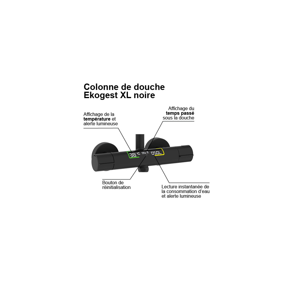 La colonne de douche thermostatique EKOGEST XL est équipée d'une large tête de douche orientable de 250 mm et d'une douchette 3 jets (pluie, massage et mixte), toutes deux dotées de picots anti-calcaire pour faciliter l'entretien.