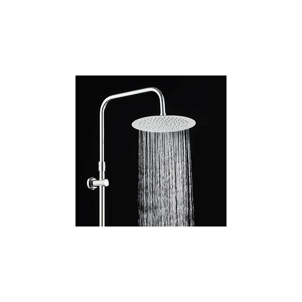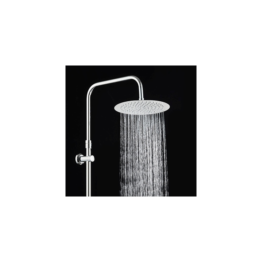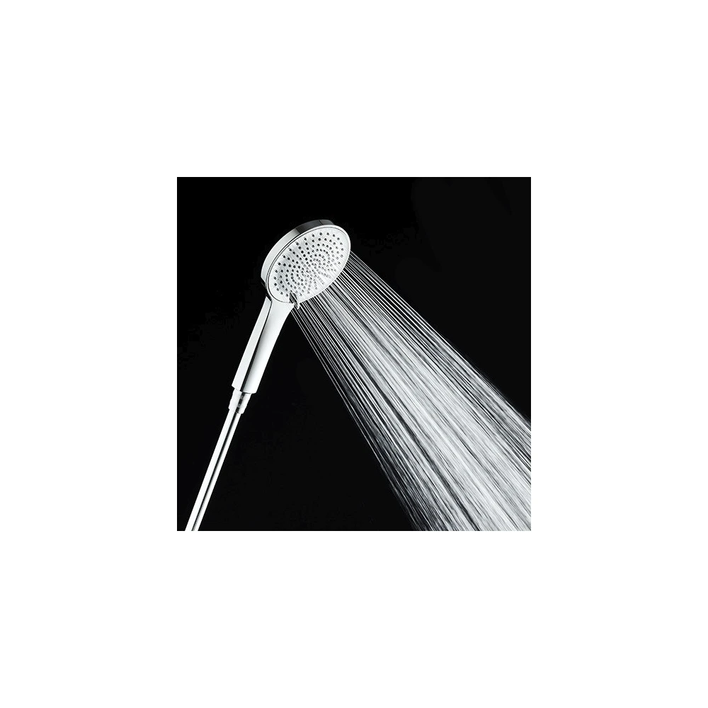 La douchette à main complète l'ensemble avec 3 types de jets, permettant d'adapter le confort selon vos envies. Le flexible PVC chromé lisse de 1,50 m, équipé d'un écrou anti-torsion intégré, assure une durabilité renforcée. La colonne est équipée d'un bras de douche télescopique, permettant un réglage précis de la hauteur. L'embase murale réglable facilite l'installation en compensant les défauts de planéité du mur ou en réutilisant les perçages existants.