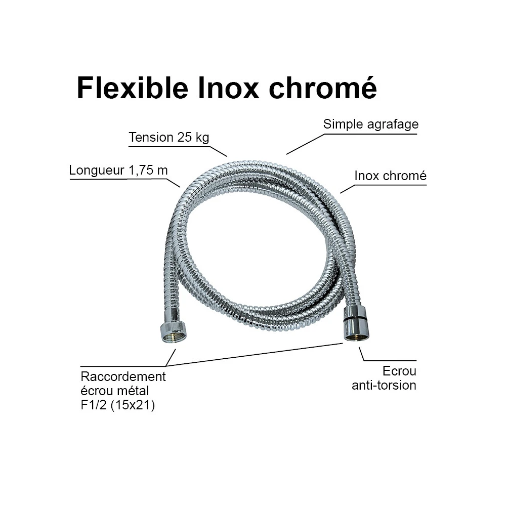 Le flexible de douche inox 1,75 m est conçu avec structure en inox chromé simple agrafage, ce qui lui confère une bonne résistance à la traction (25 kg) tout en garantissant une grande souplesse d'usage.