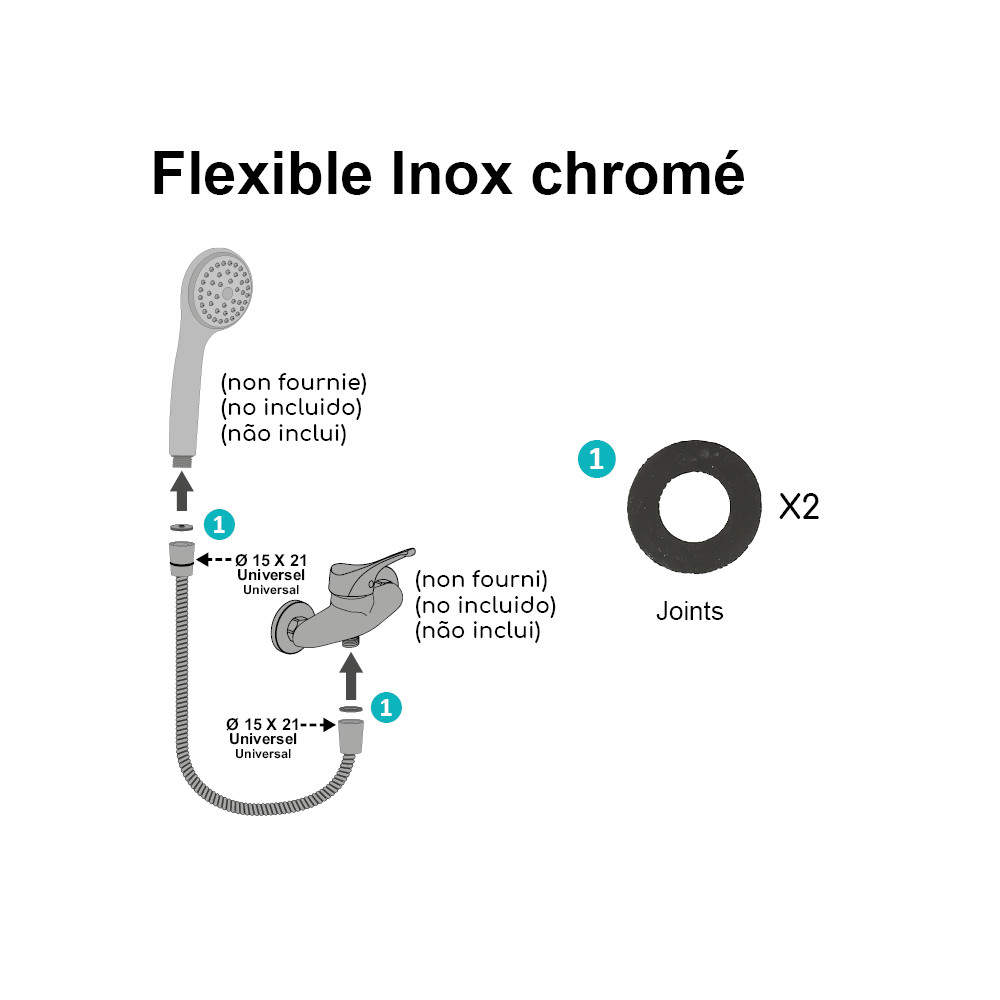 Grâce à ses écrous métal F1/2 (15x21), il est compatible avec la majorité des douchettes et robinets standards.