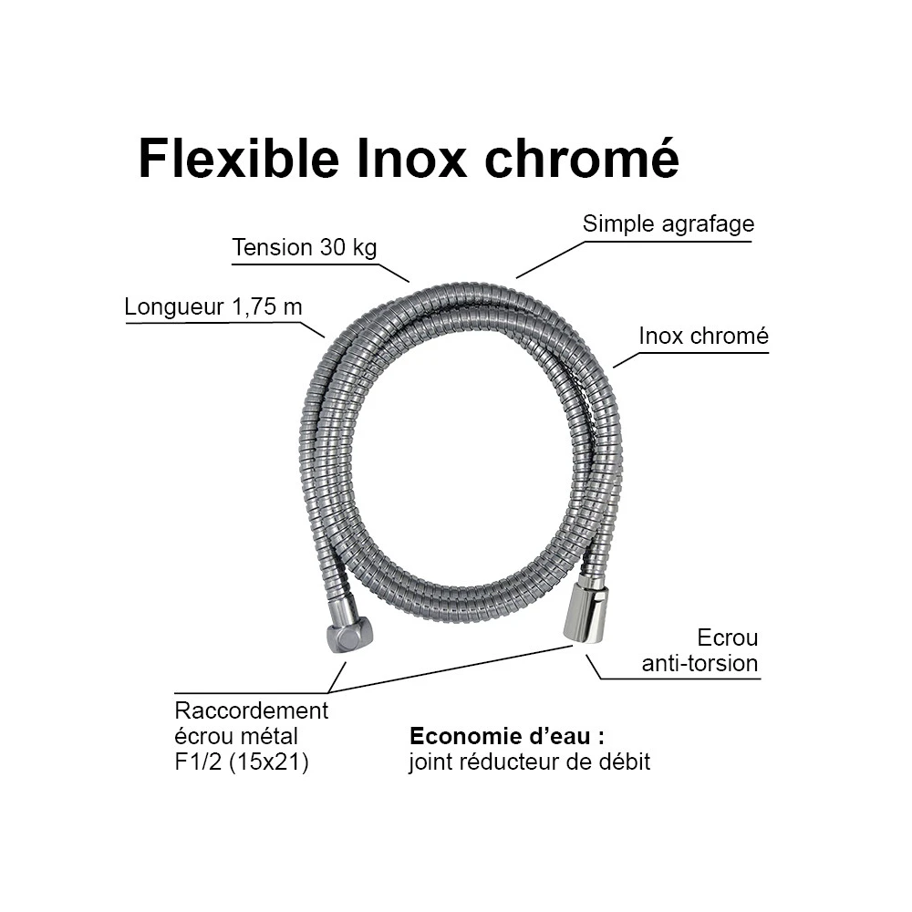 Flexible de douche inox 1,75 m simple agrafage, anti-torsion et joint réducteur de débit.