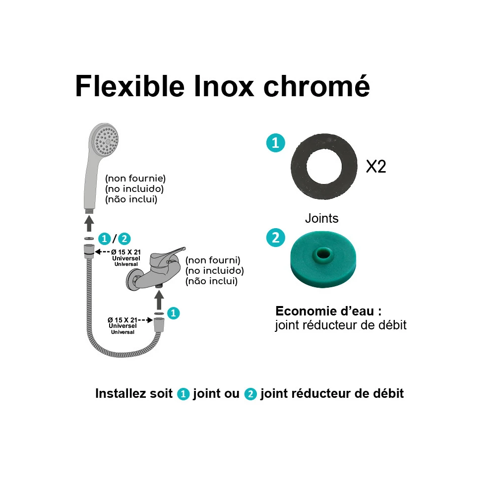 Doté d'embouts sertis de sécurité et de joints d'étanchéité, il garantit une installation fiable et une utilisation en toute sécurité. Ses écrous métal F1/2 (15x21) lui confèrent une compatibilité universelle avec la plupart des douchettes et mitigeurs standards. Son joint réducteur de débit permet également de réduire sa consommation d'eau sans perte de confort.