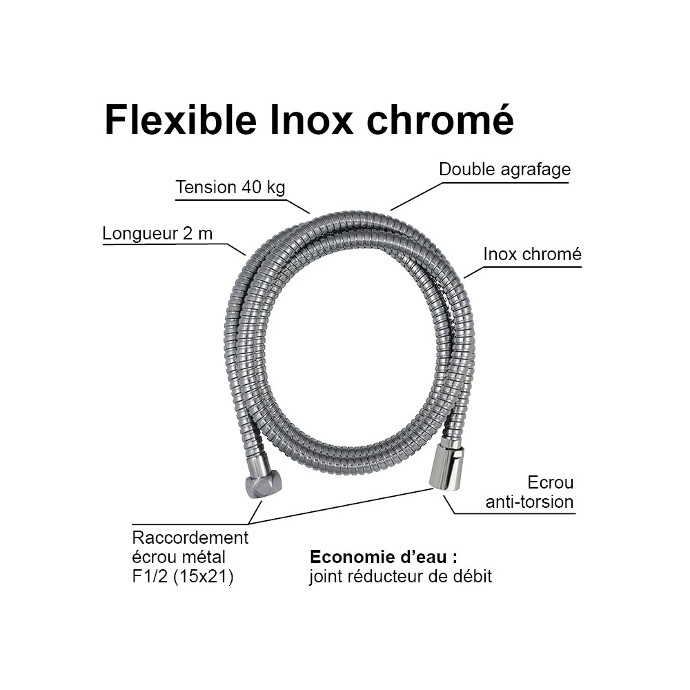 Flexible de douche inox 2,00 m double agrafage, anti-torsion et embouts sertis.
