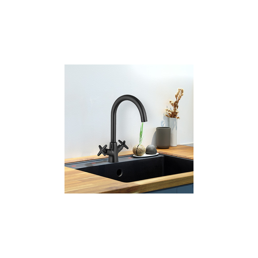 Le mélangeur d'évier NANKA est équipé de têtes céramiques 1/4 de tour et de poignées métalliques, assurant un réglage fluide de la température et du débit. Son bec mobile offre une grande liberté de mouvement, idéale pour la cuisine.