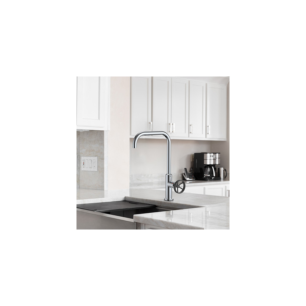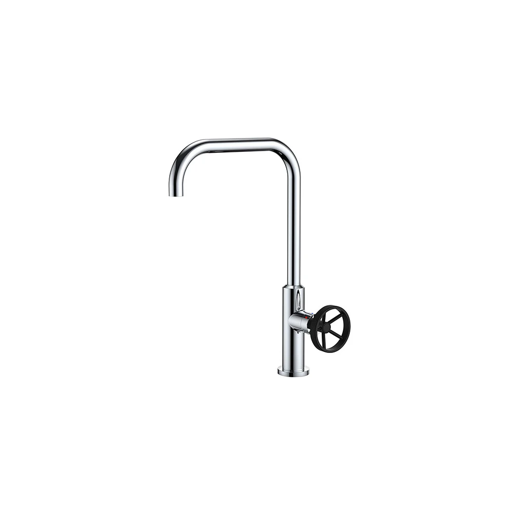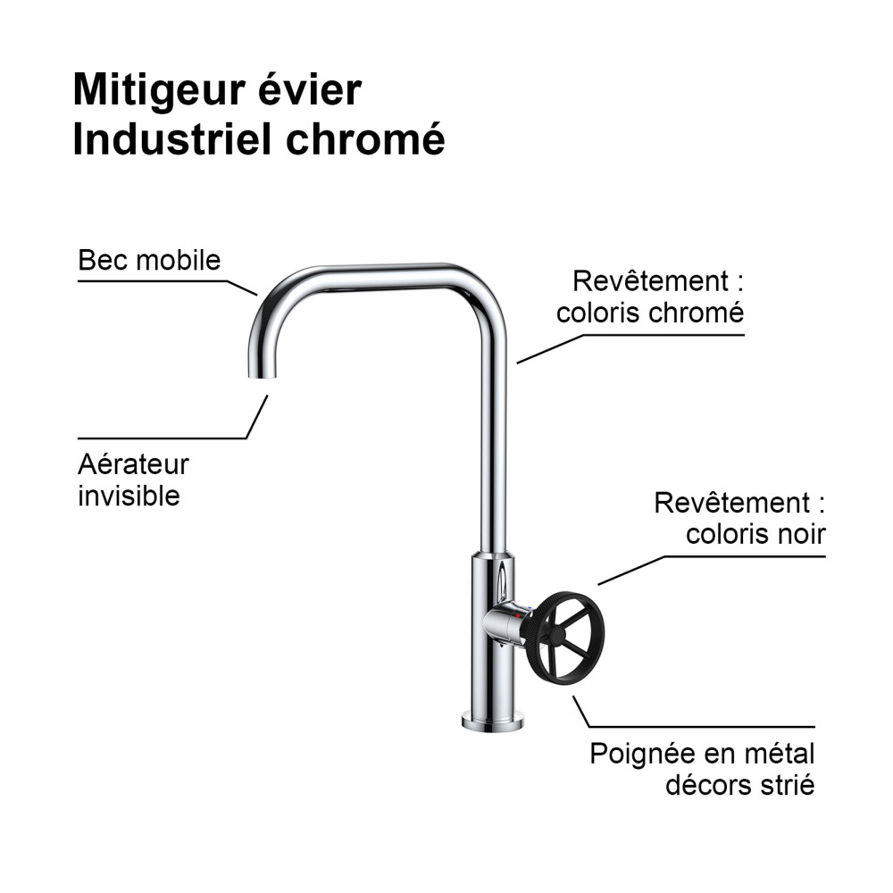 Le mitigeur évier INDUSTRIEL à bec haut est équipé d'une cartouche céramique diamètre 25 mm. Il est doté d'une seule poignée qui permet de régler la température et le débit de l'eau. La commande s'effectue par une poignée en métal décor strié placée sur le côté.