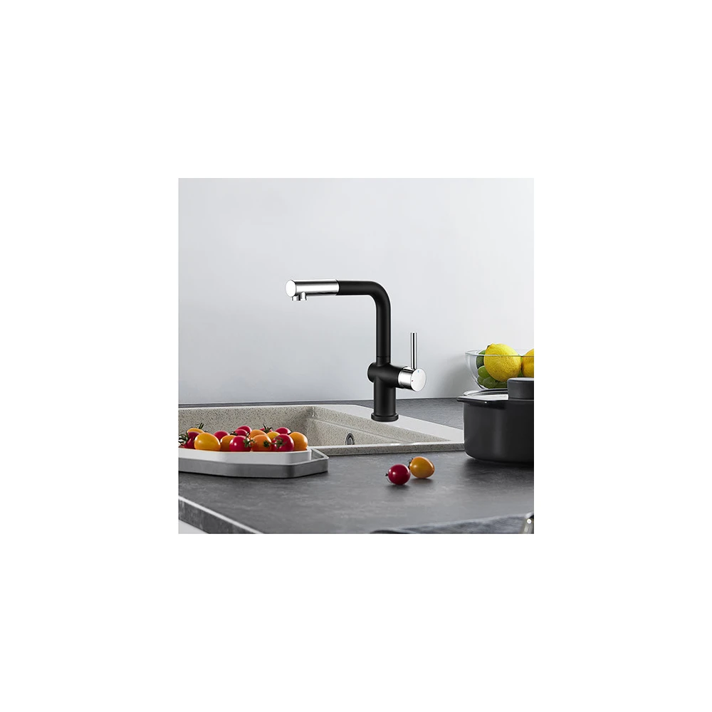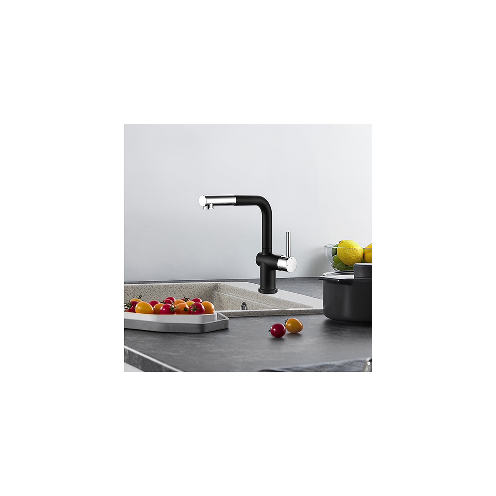 Son bec orientable est équipé d'une douchette extractible à deux jets, avec flexible de 1,20 m renforcé, idéale pour le nettoyage et le rinçage.