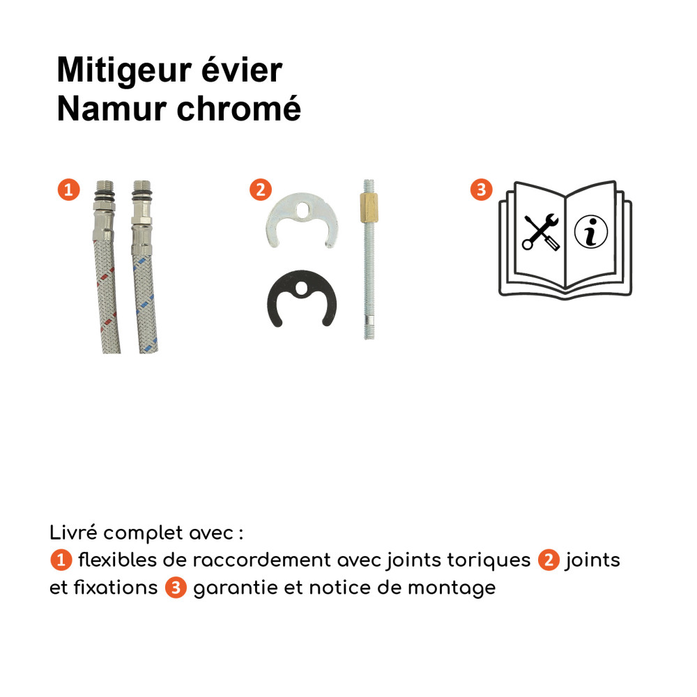 Le mitigeur évier NAMUR est équipé d'une cartouche céramique diamètre 35 mm. Il est doté d'une seule poignée qui permet de régler la température et le débit de l'eau.