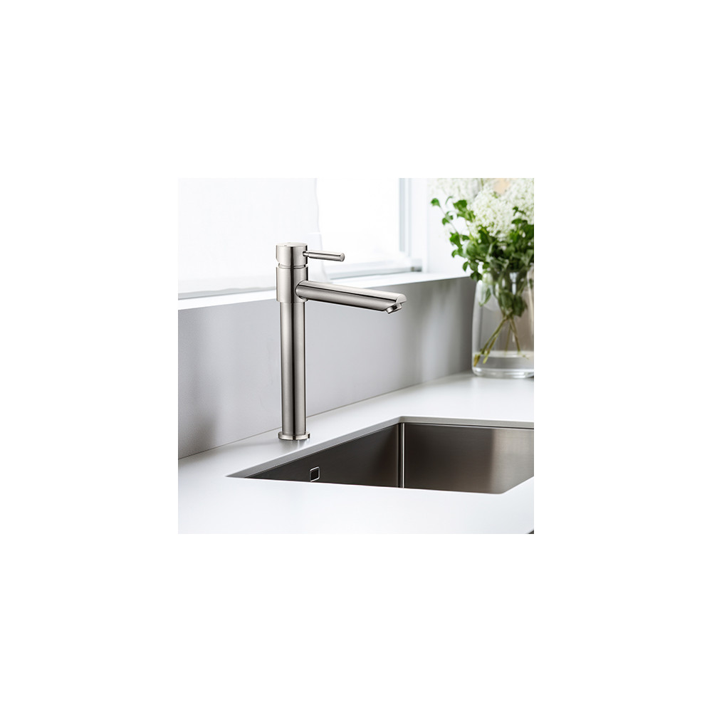 Ce mitigeur encastré est conçu pour optimiser l'espace dans la cuisine. Installé dans le plan de travail, il se replie lorsqu'il n'est pas utilisé et libère toute la surface.