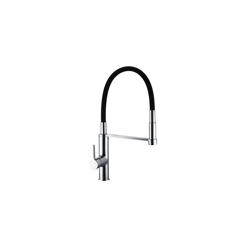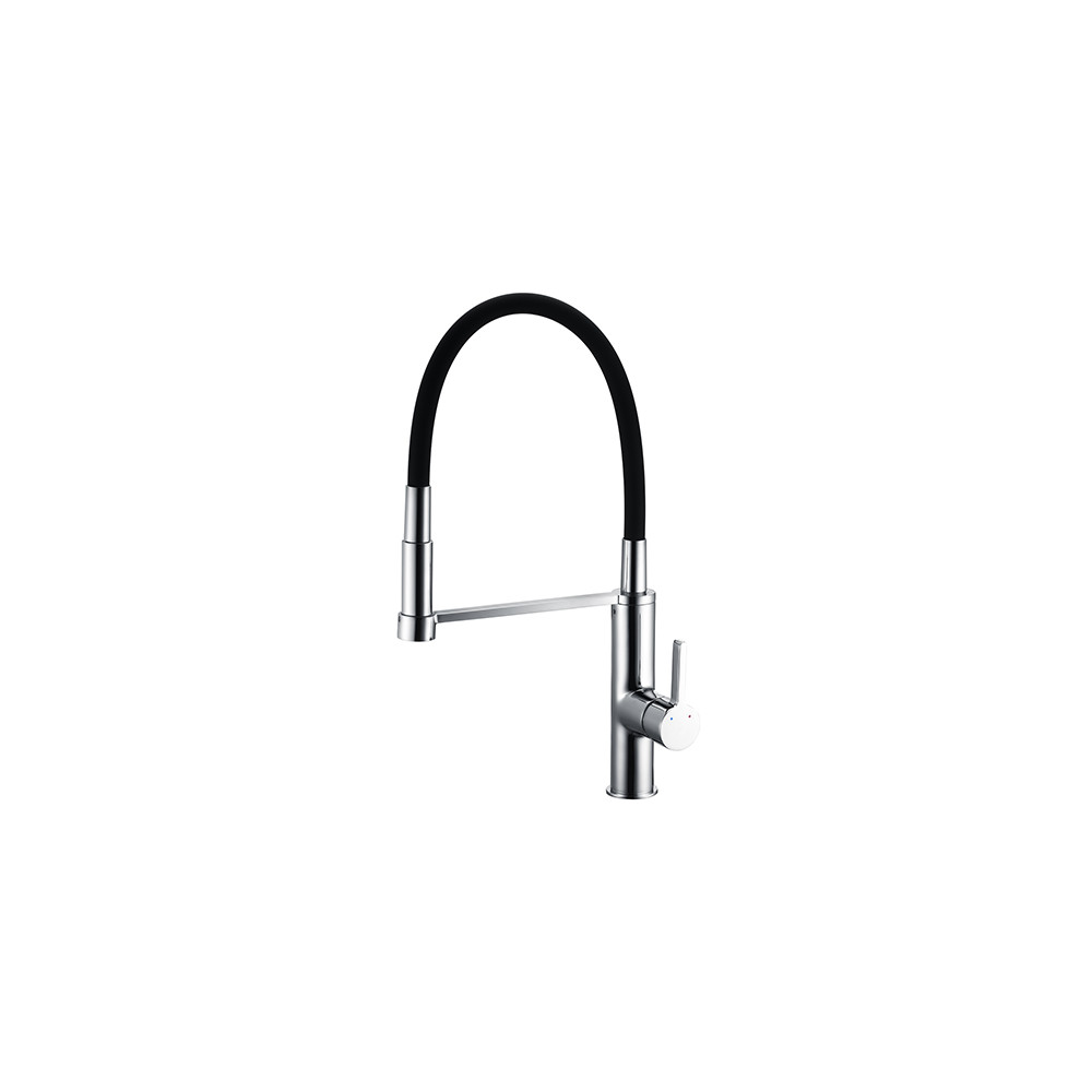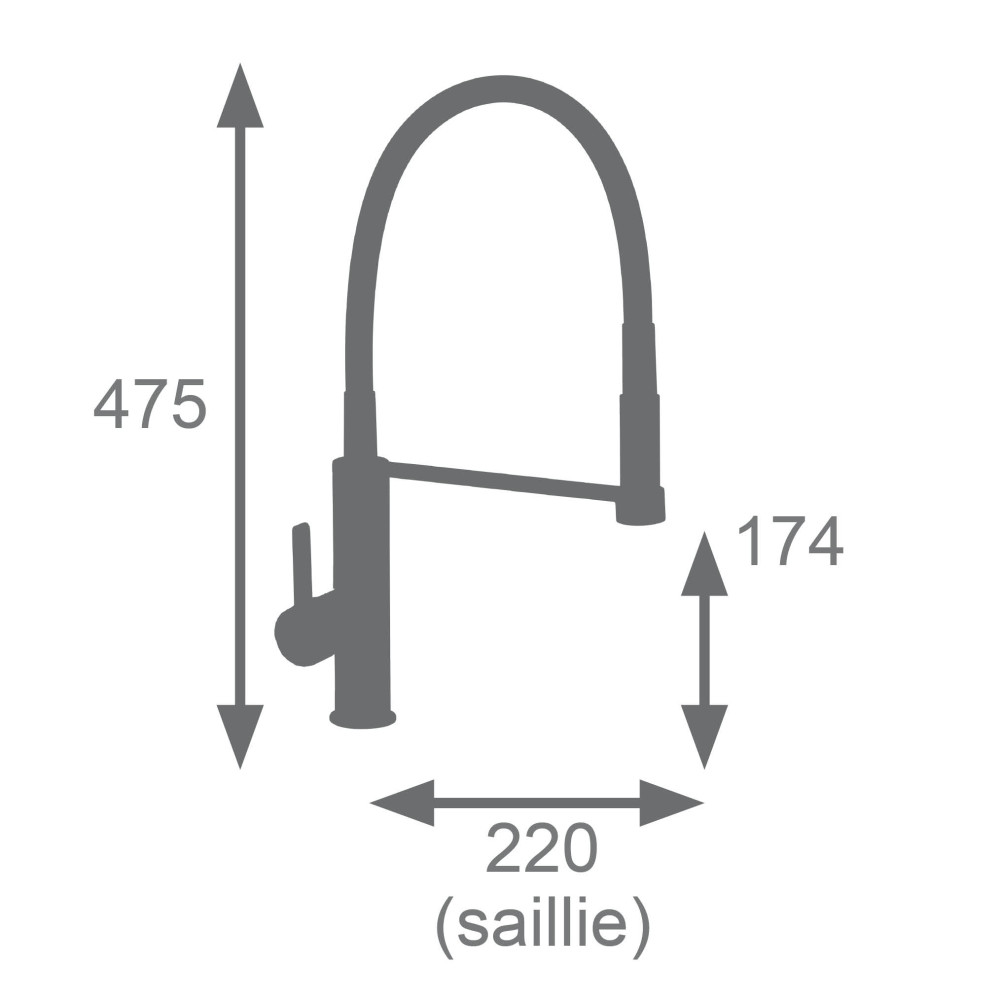 Son bec tube mobile et orientable à 360° est équipé d'un bec douchette extractible à deux jets (pluie et jet mousse), il facilite le rinçage et le nettoyage. Il est muni d'un aérateur anti-éclaboussure et d'un écrou de serrage rapide pour faciliter l'installation. Le flexible nylon mesure 150 cm. L'embase mesure 54 mm de diamètre.
