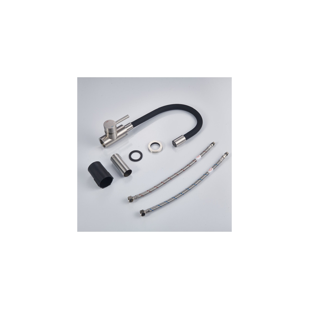 Livré avec deux flexibles de raccordement inox F3/8 (12x17) de 40 cm, joints toriques, cale de compensation, fixations et notice de montage.