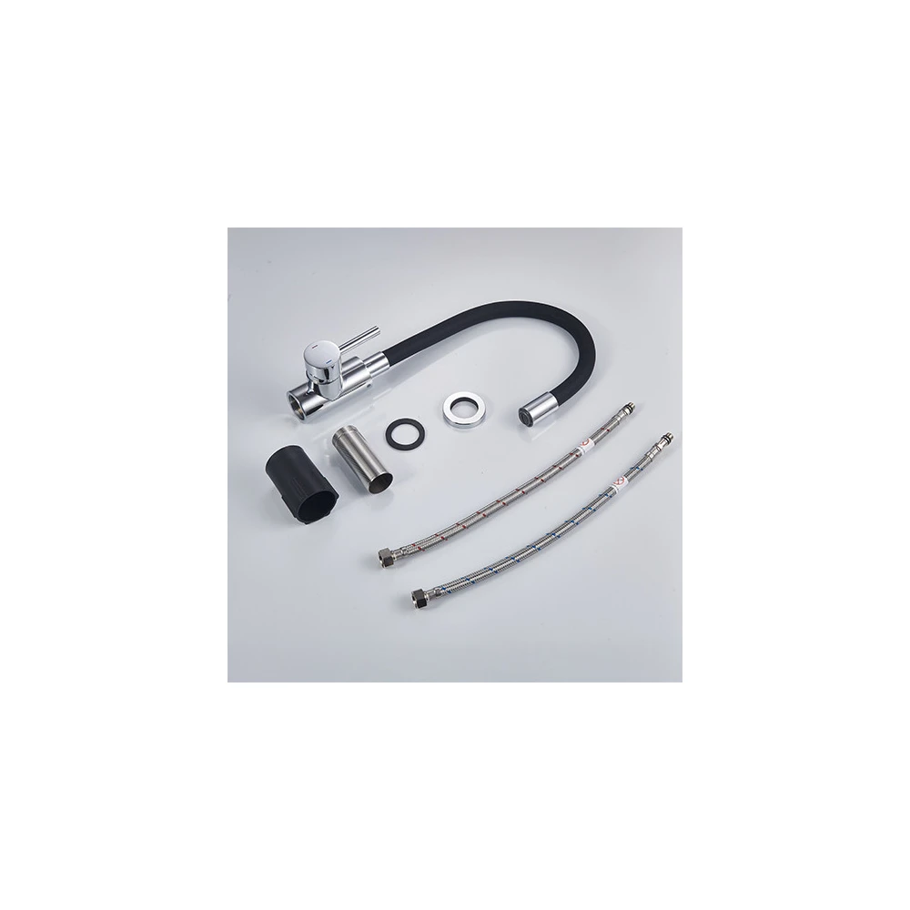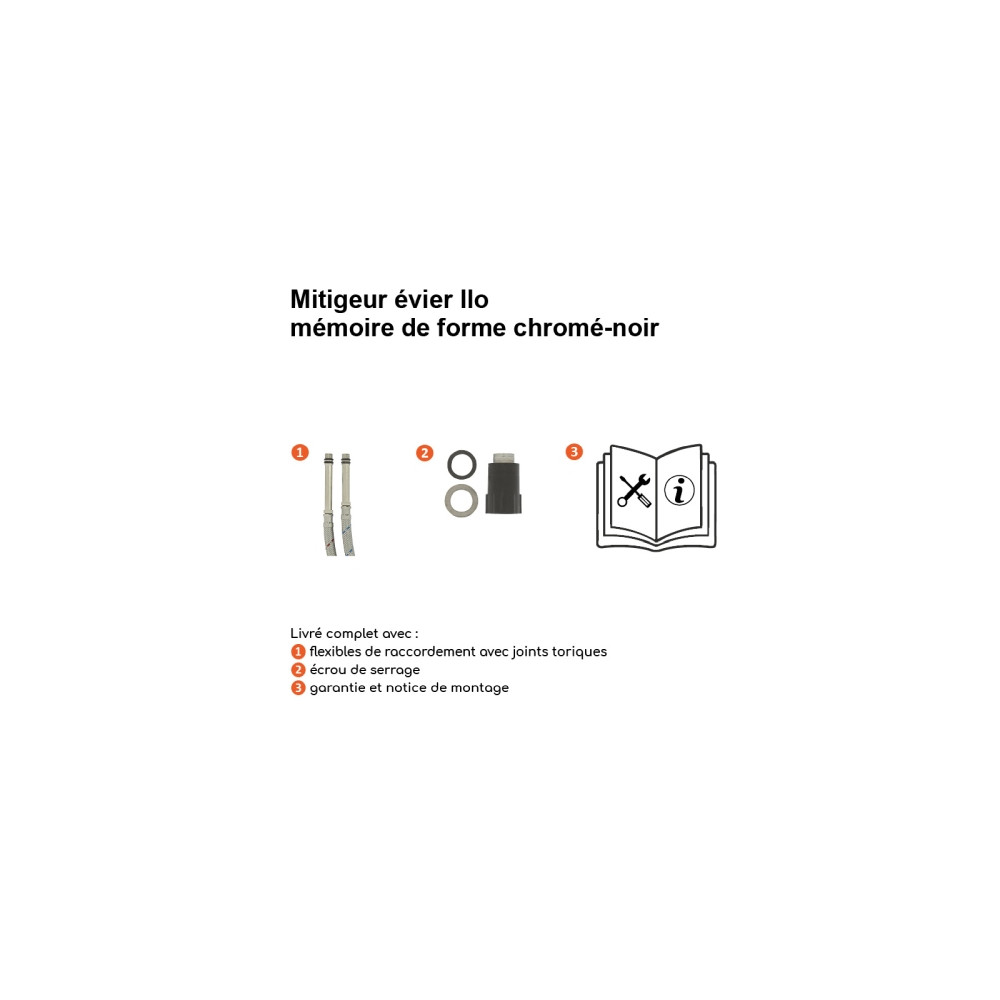 Livré avec deux flexibles de raccordement inox F3/8 (12x17) de 40 cm, joints toriques, cale de compensation, fixations et notice de montage.