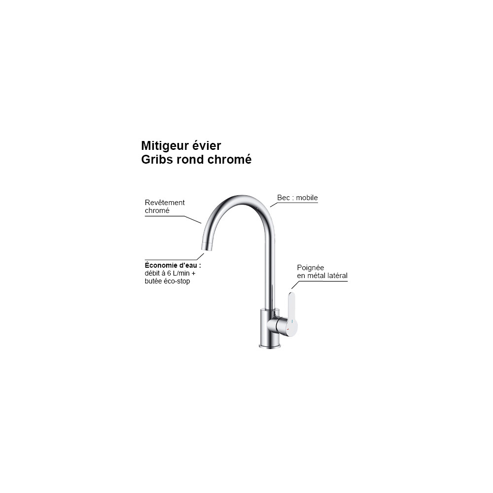 Le mitigeur évier GRIBS RAPIDFIX à bec haut rond est équipé d'une cartouche céramique, il est doté d'une seule poignée qui permet de régler la température et le débit de l'eau.
