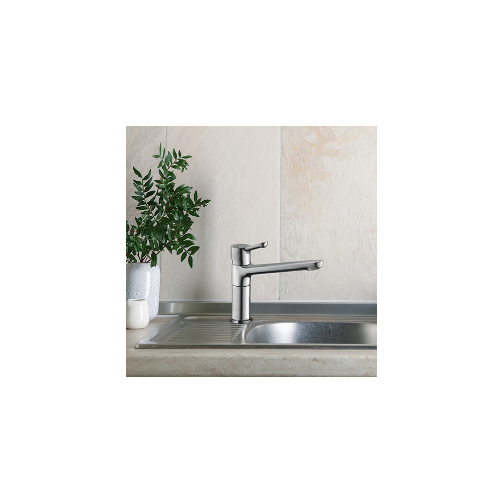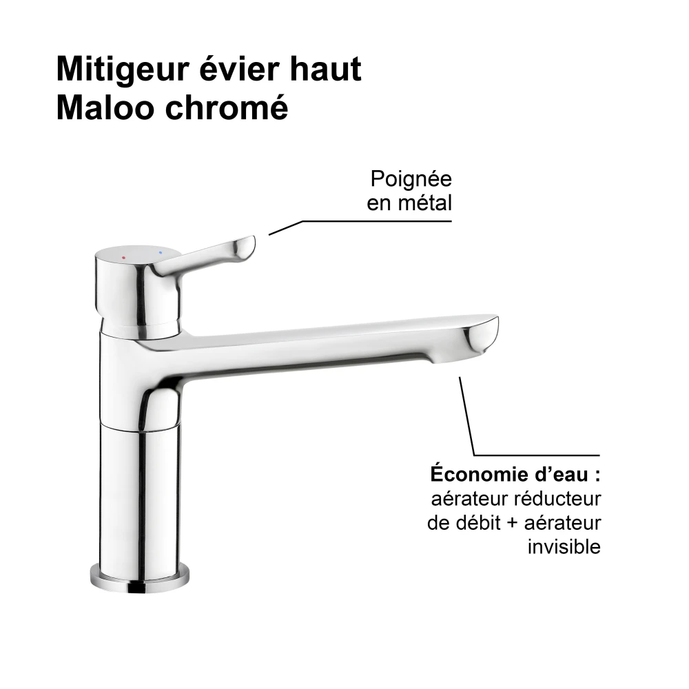 Le mitigeur évier MALOO à bec haut est équipé d'une cartouche céramique diamètre 35 mm. Il est doté d'une seule poignée qui permet de régler la température et le débit de l'eau.
