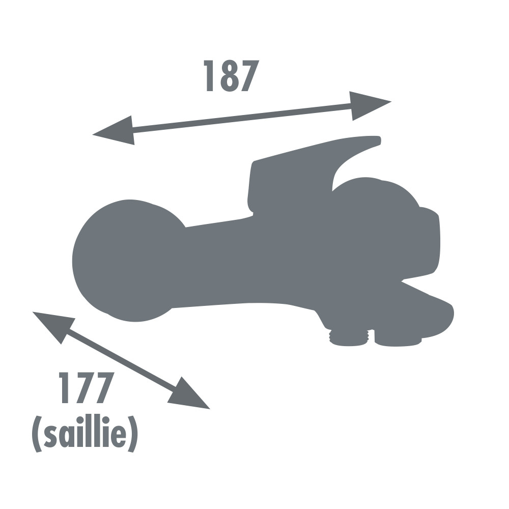 Le bec intègre un aérateur grand débit (28 L/minute) et un inverseur permettant de basculer facilement entre la fonction bain et la fonction douche. L'entraxe de raccordement est de 150 mm.
