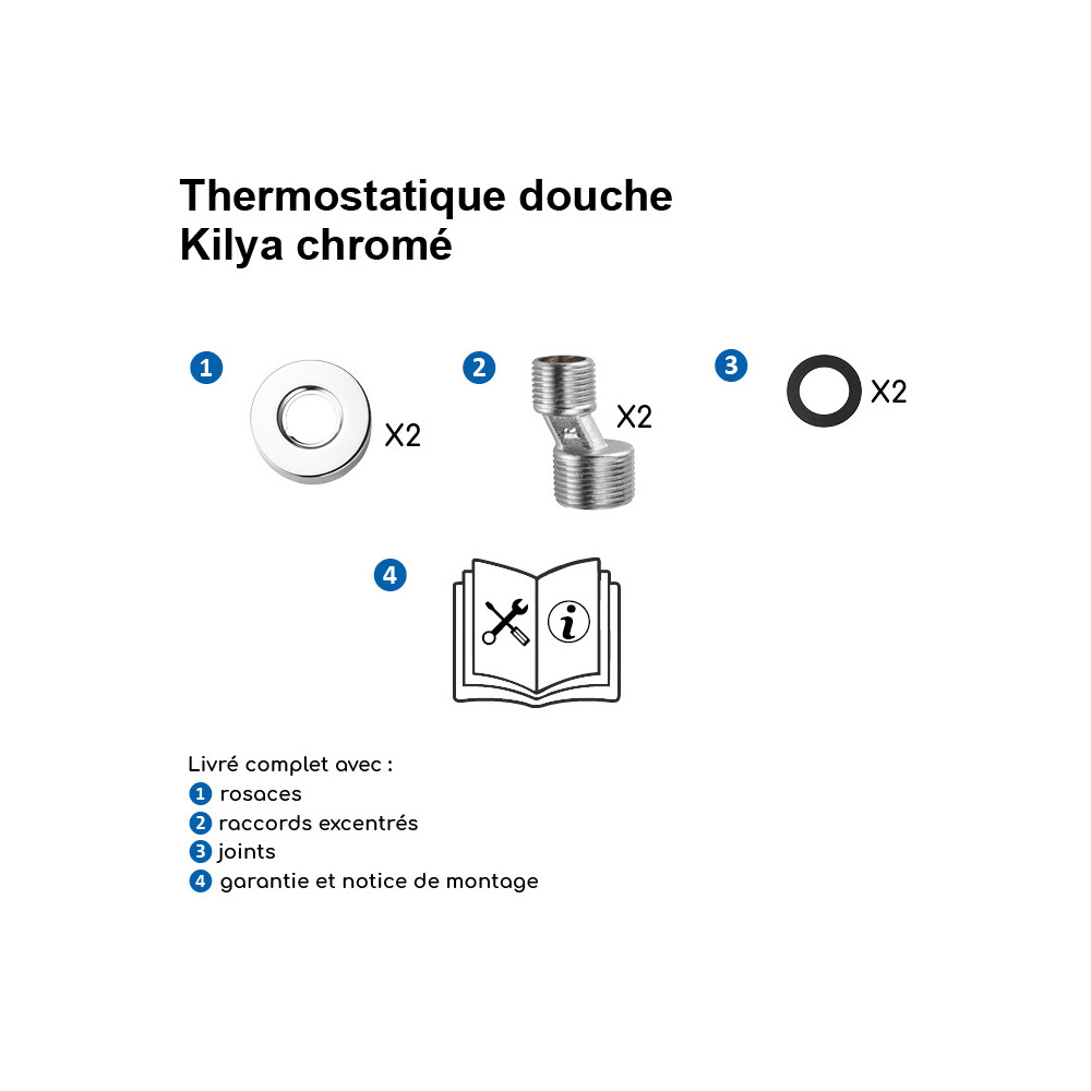 Livré complet avec rosaces, raccords excentrés, joints et notice de montage pour une installation simple.