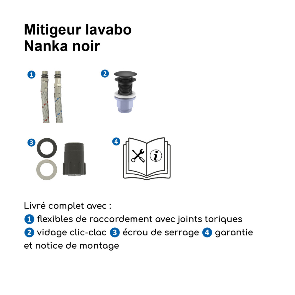 Livré complet avec flexibles de raccordement, vidage clic-clac, écrou de serrage, joints et notice de montage.