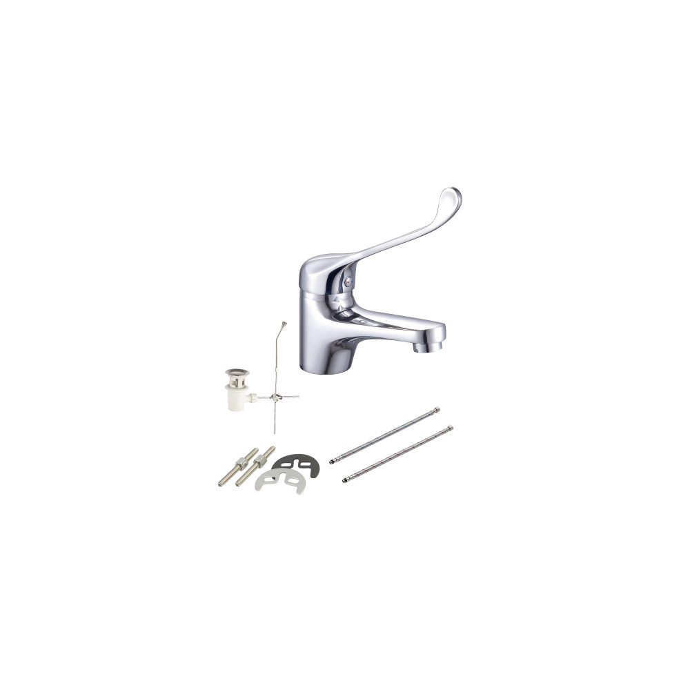 Équipé d'une cartouche céramique diamètre 40 mm, il dispose d'un aérateur 15 L/min permettant de diminuer la consommation d'eau. Sa poignée allongée en métal est conçue pour faciliter la préhension et le réglage de la température et du débit. Le bec est fixe et le vidage avec bonde plastique est fourni.