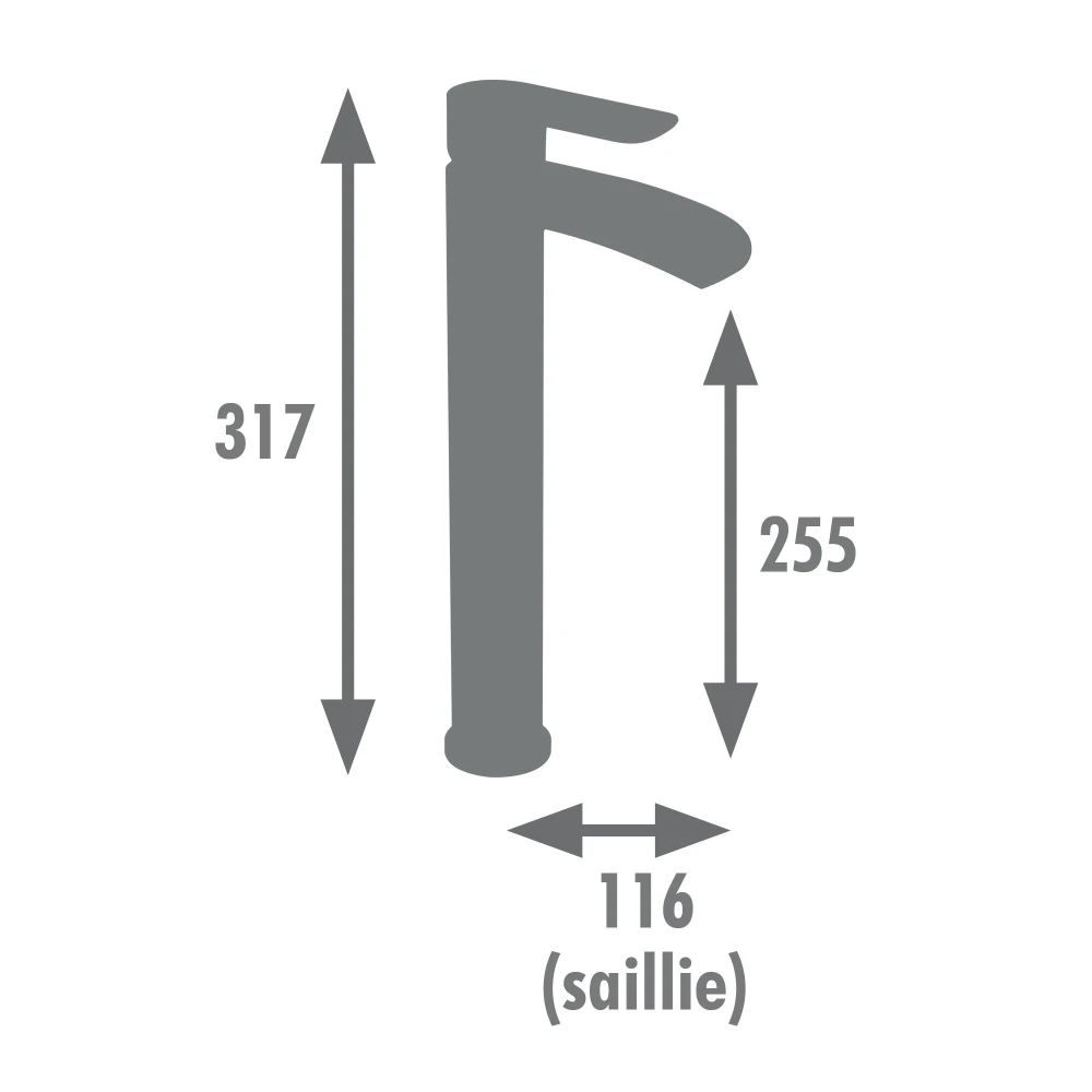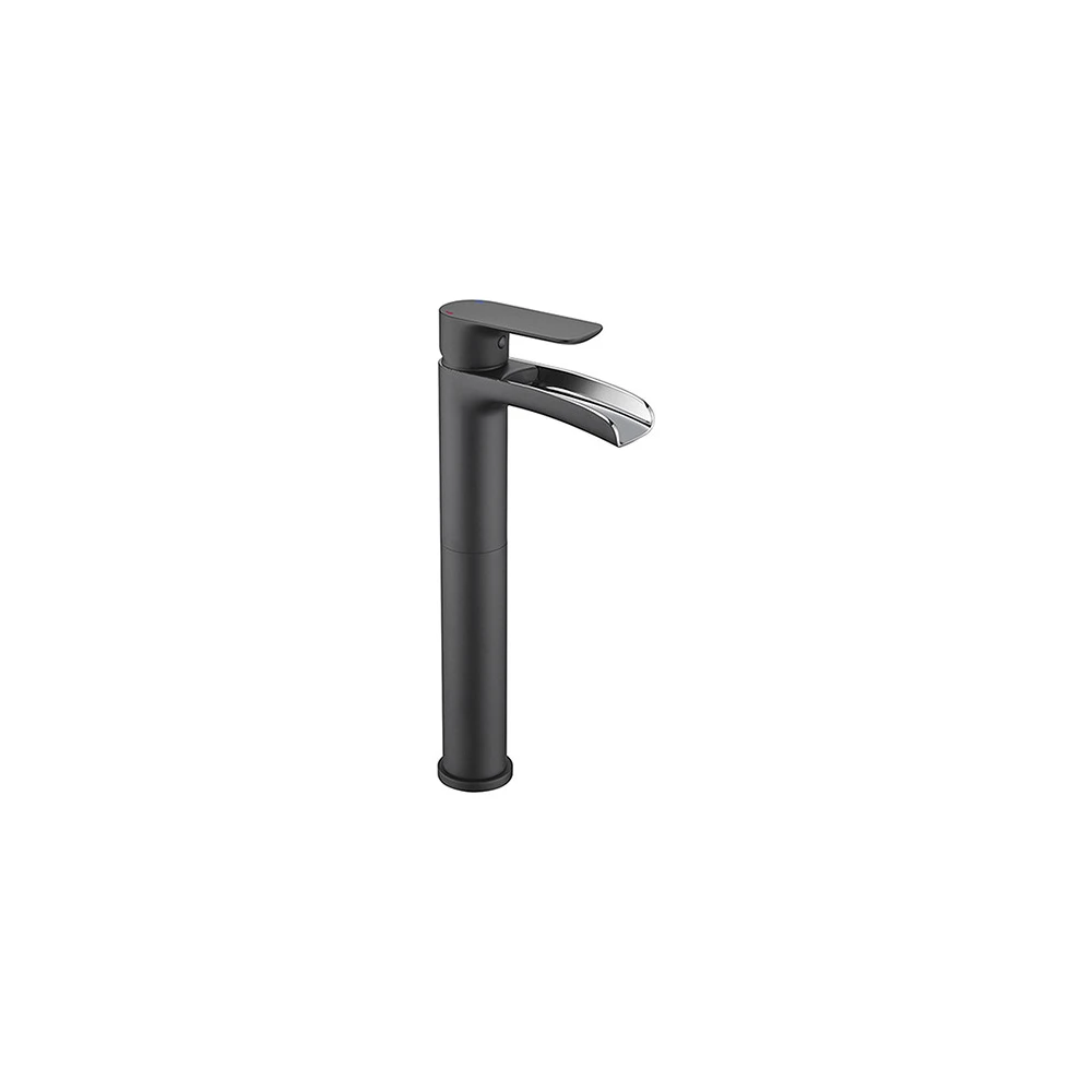 Équipé d'une cartouche céramique diamètre 25 mm, il est doté d'une poignée en métal permettant de régler la température et le débit. Le bec ouvert offre un effet cascade au jet d'eau.