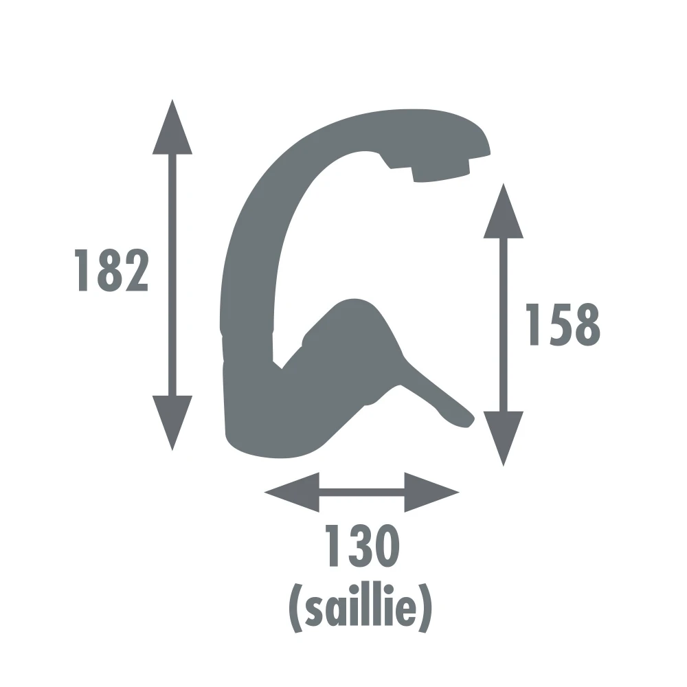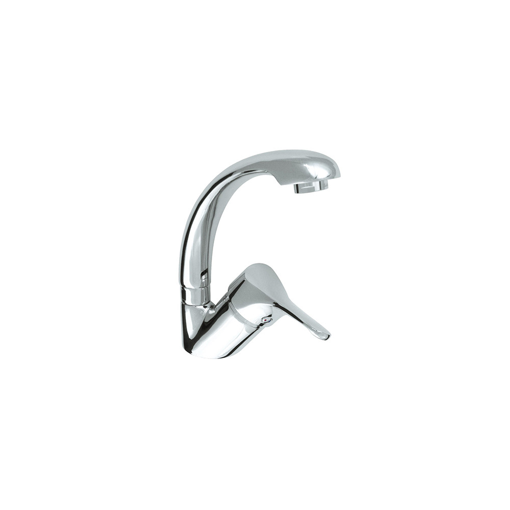 Équipé d'une cartouche céramique diamètre 40 mm, il dispose d'une butée éco-stop pour limiter le débit et d'un aérateur réducteur permettant de diminuer la consommation d'eau. La poignée en métal permet de régler la température et le débit. Le bec est courbé et fixe. Le vidage avec bonde plastique est fourni.