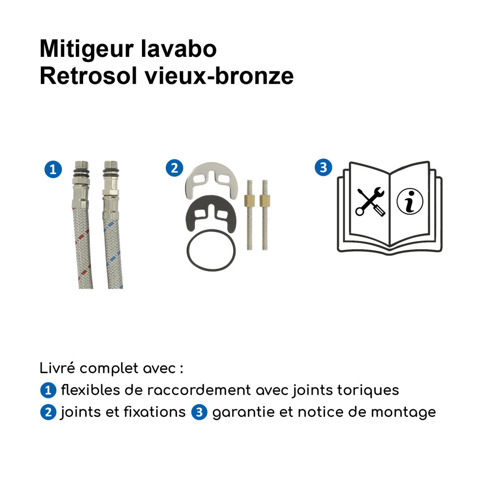 Livré complet avec flexibles de raccordement inox F3/8 (12x17), vidage clic-clac, joints, écrou de serrage et notice de montage.
