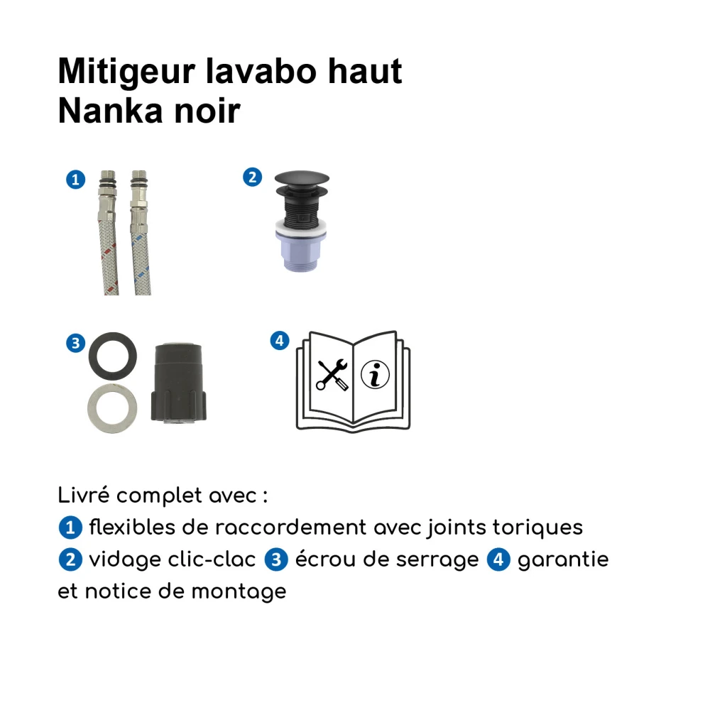 Livré complet avec flexibles de raccordement inox F3/8 (12x17), vidage clic-clac, joints, écrou de serrage et notice de montage.