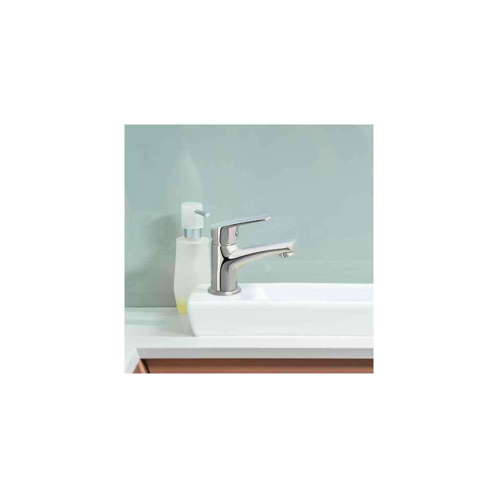 Il est équipé d'une cartouche céramique de 35 mm et d'un aérateur avec un débit 15 L/min. La poignée permet de régler facilement le débit et la température. Le bec fixe repose sur une embase de 50 mm. Le modèle est fourni avec un vidage clic-clac ABS NF et des flexibles de raccordement inox F3/8 (12x17).