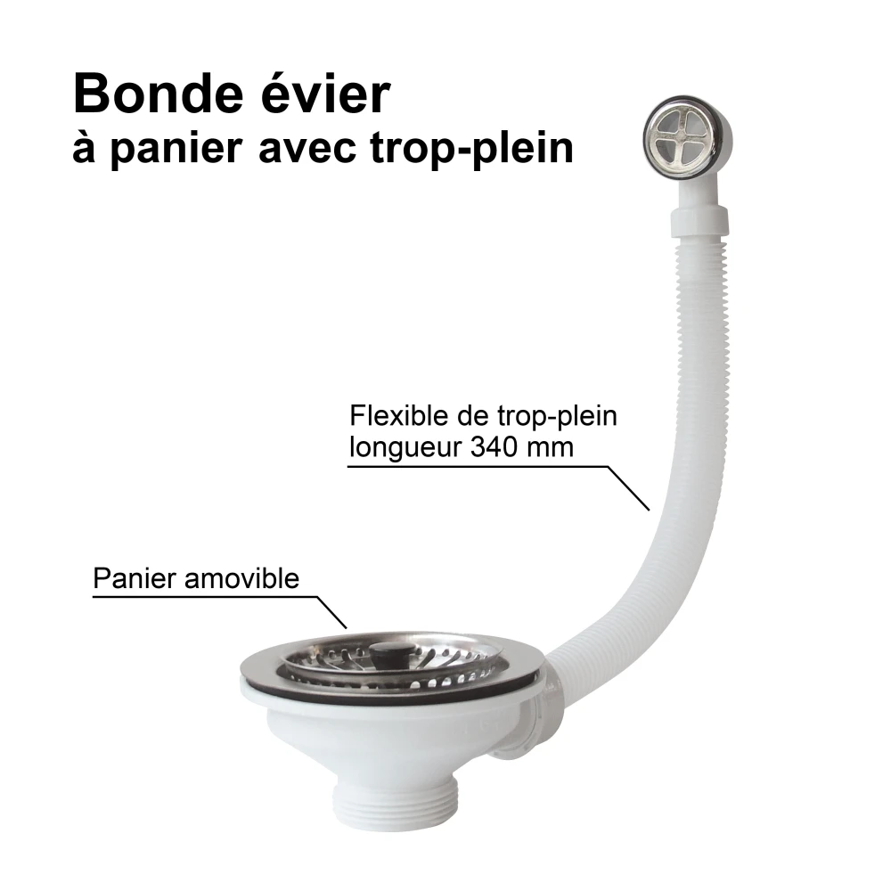 Bonde à panier pratique avec trop-plein intégré, idéale pour éviers percés Ø90 mm.