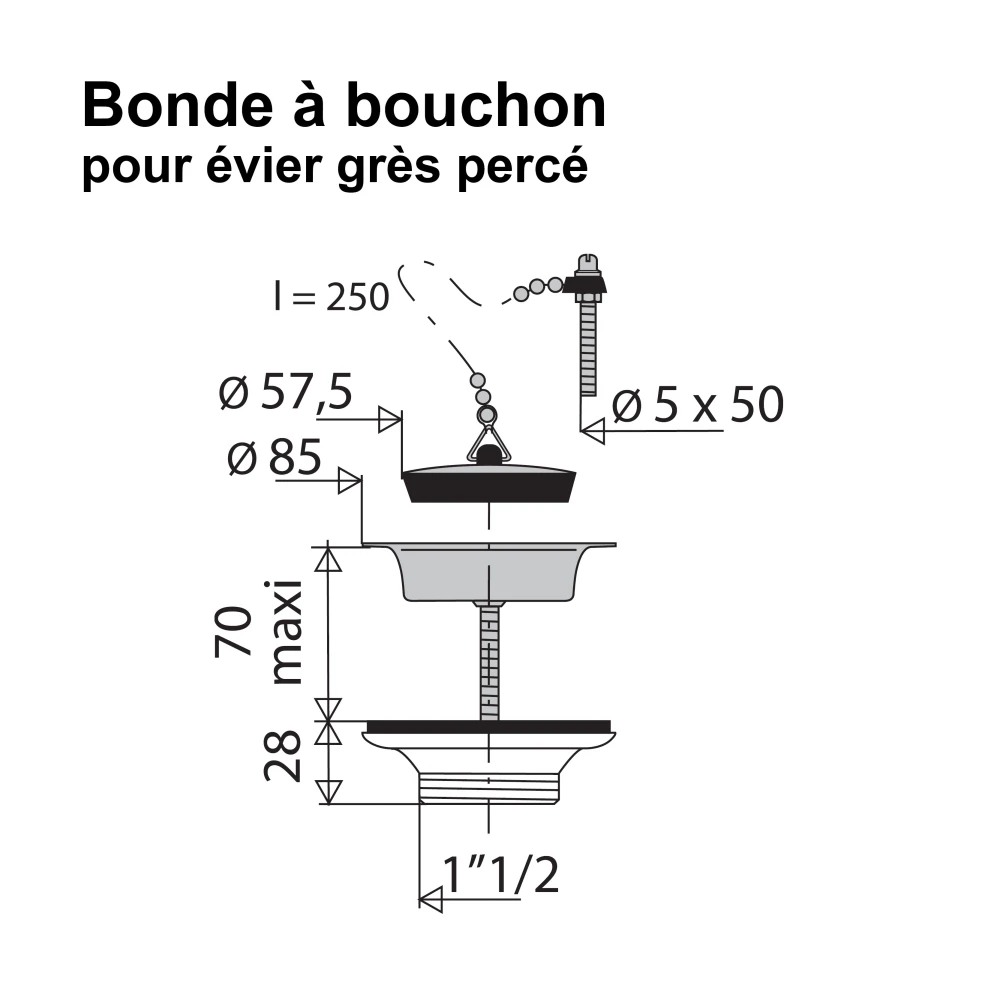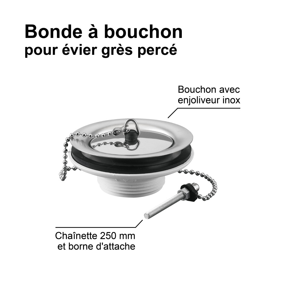 La bonde à bouchon est conçue pour équiper les éviers en grès percés Ø 60 mm, sans trop-plein. Le bouchon amovible relié par une chaînette permet de retenir ou d'évacuer l'eau facilement.