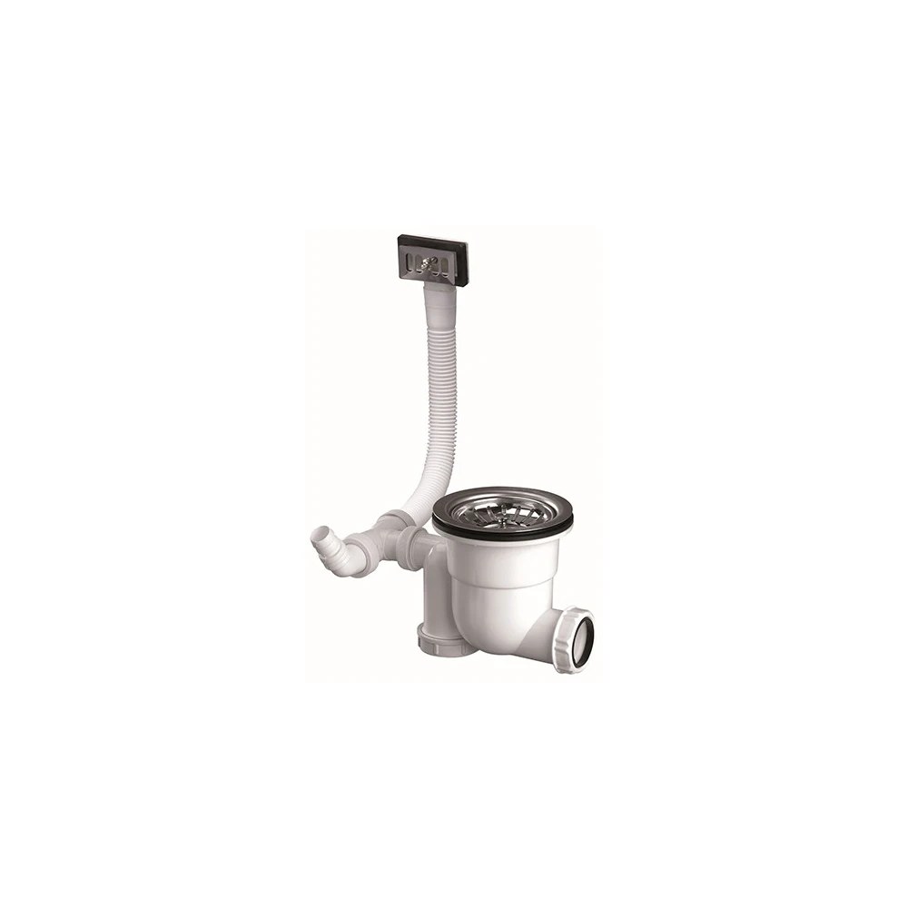 Équipée d'une prise pour machine à laver ou raccord trop-plein. Panier en inox Ø 83 mm, tube de trop-plein 330 mm et évacuation Ø 40 mm. Débit 50 L/min. Nettoyage facile par le dessus. Certifiée NF.