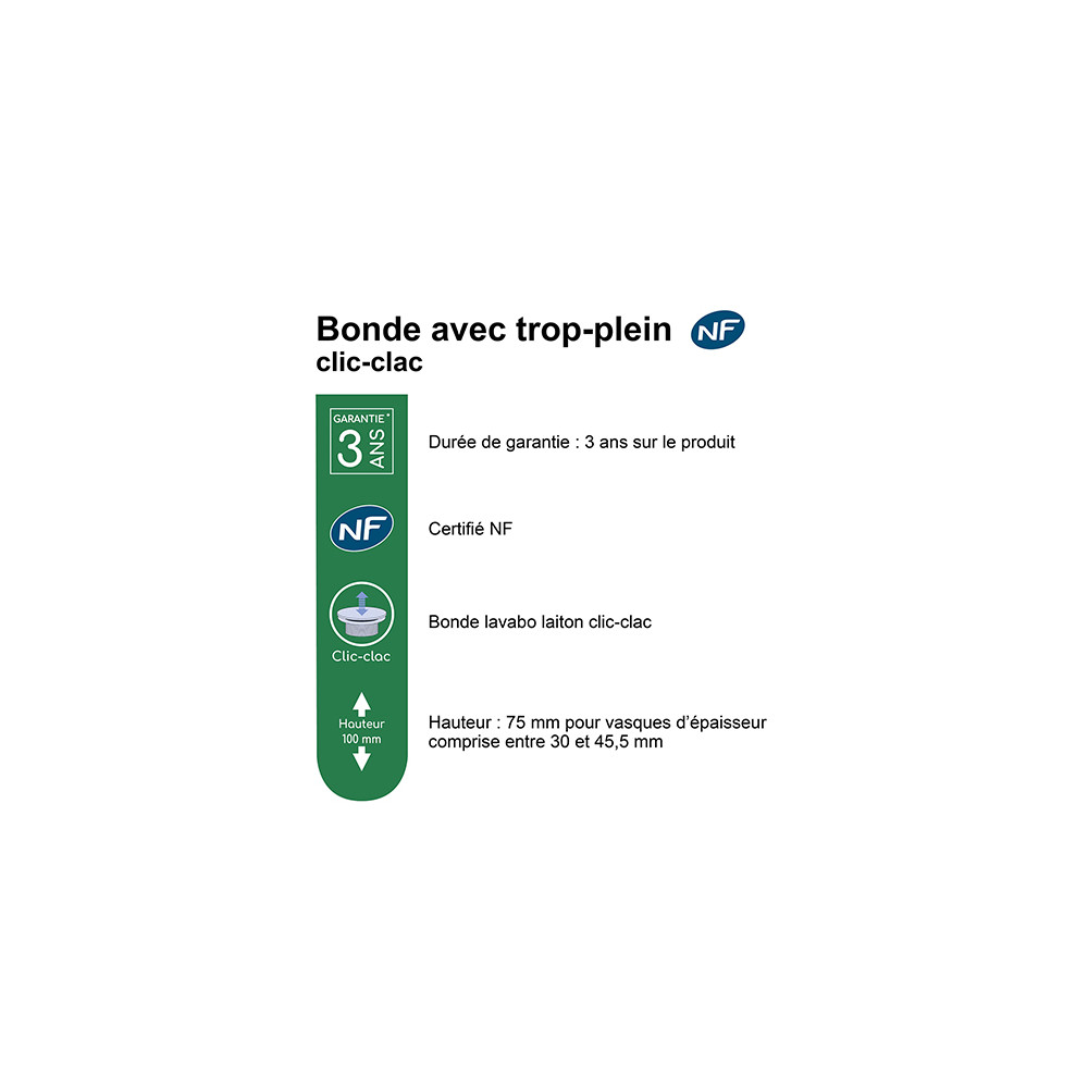 Bonde de lavabo clic-clac - avec trop plein - Certifié NF